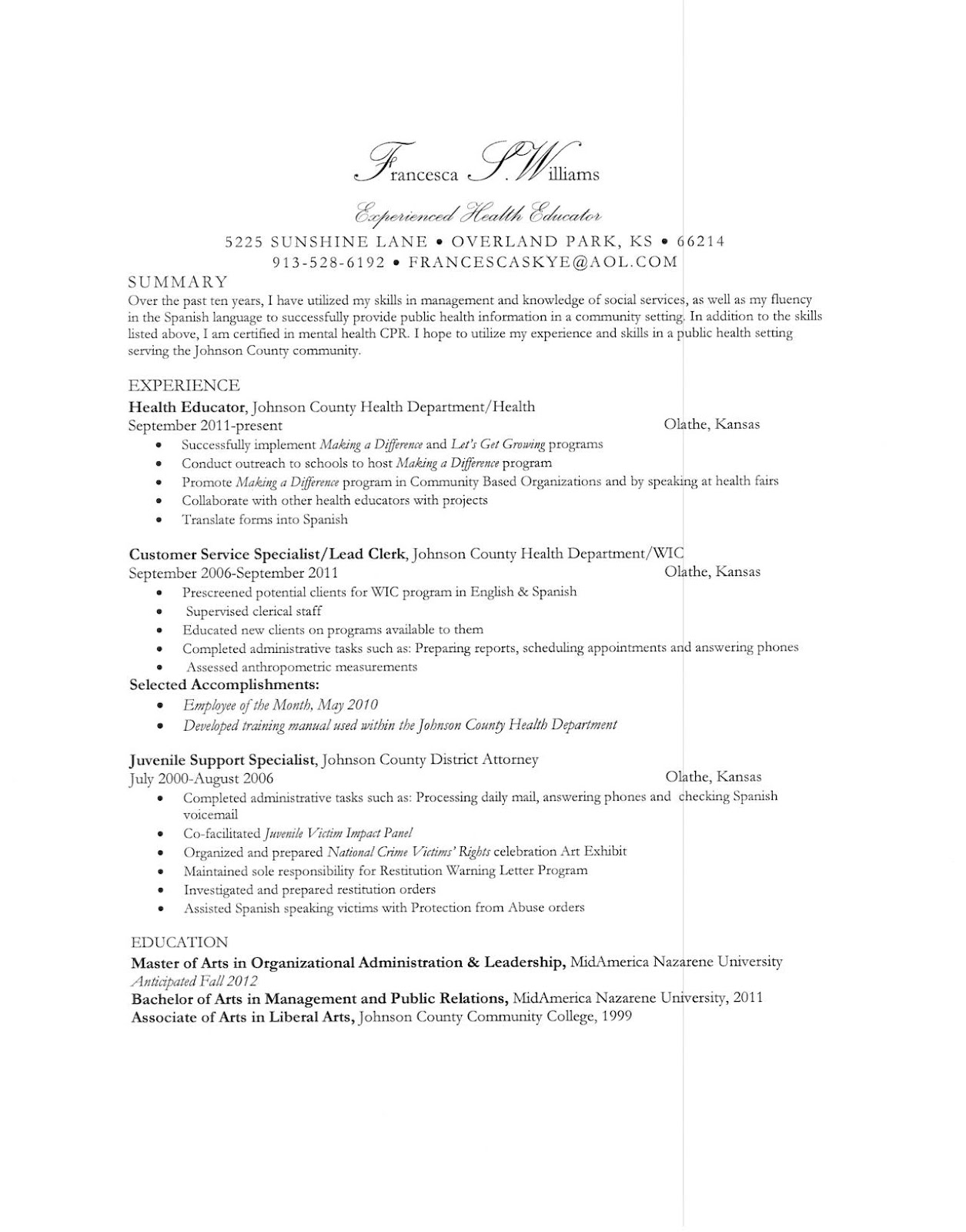 Summary of public health educator.